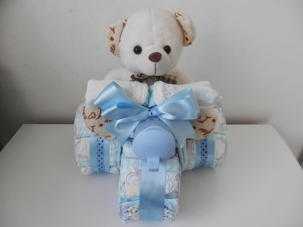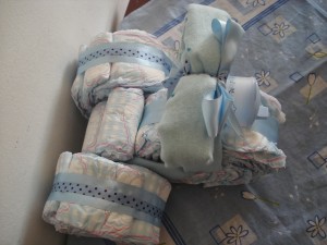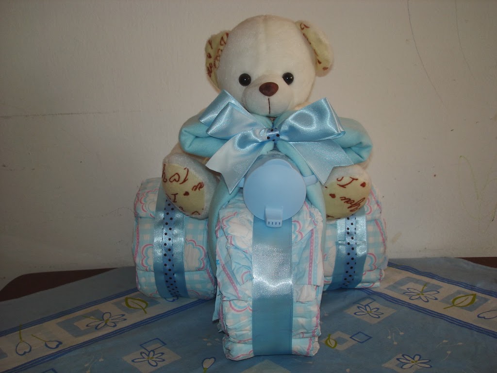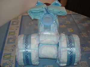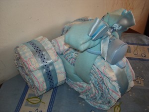 Outra gracinha que fiz para decorar o chá de bebê foi esse triciclo de fraldas.