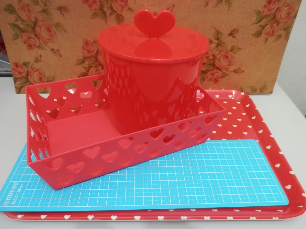 Uma bandeja de coraçõezinhos, uma cestinha de corações vazados, um potinho com tampinha de coração (na etiqueta diz que é porta algodão mas pretendo usar como lixeirinha de mesa) e uma mini base de corte.